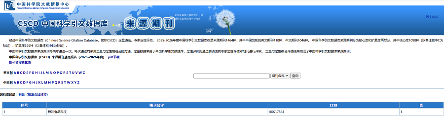 我院《糧油食品科技》再度被中國科學引文數據庫(CSCD)(2025-2026年度)收錄